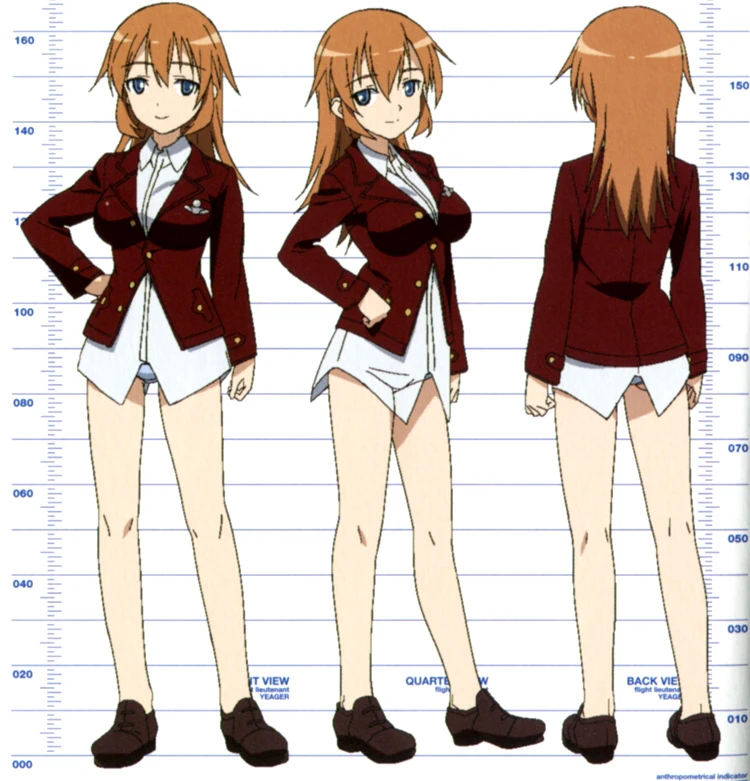 Charlotte likes to travel. Her dream was to became a singer, but after view the Witches flying in the sky, her dream becomes to break the sound barrier. She is also proud, but friendly. Her favourite glasses was a one pair that she used to break the speed record on land, before she enlisted. Charlotte rarely was scary, actually she is very reckless. She's strong, passionate, and outgoing, but she's only outspoken when dealing with certain people. She doesn't back down from any challenge even going so far as to charge a Neuroi in an unarmed plane. Shirley spends her spare time in the machine shop and making further modifications to her Striker. It is open and friendly, makes friends quickly and easily becomes the soul of any company. Yeager has an honest and straightforward nature. At times, it may seem rough, but natural good nature makes it a popular favorite.