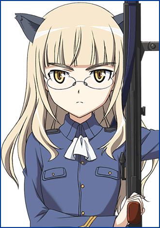 - "Glasses? Yeah, she's actually a good person, but why can't she be a little more true to her own feelings? She's talented both when it comes to dog-fighting and magic and she's way more serious than the rest of us concerning training. But well... I guess she just wants to be close to the Major. She tries to hide it, but that stubbornness just makes it even funnier."